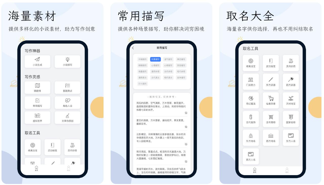 丰富的素材是软件的一大优势,可以帮助各位更快速的激发灵感,而软件当中也会提供小说生成的功能,大家只需要将内容大纲进行填写,随后AI就会帮助各位创建一段有趣的故事。同时,在角色不知道如何取名的情况下,也可以依靠应用工具来进行。