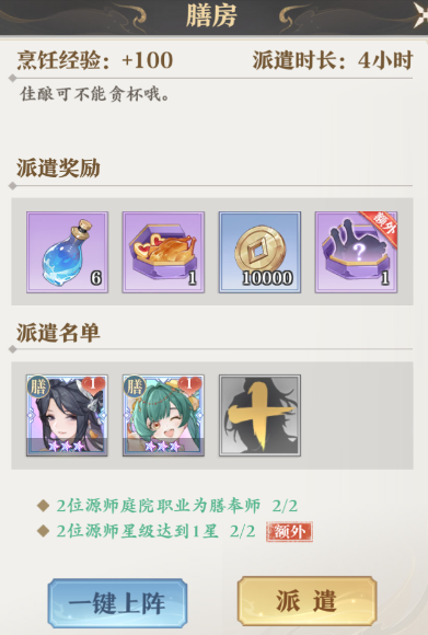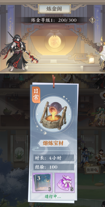 炼金阁的玩法也是类似于派遣任务,玩法其实都是挺相似的,只是获得的奖励和材料都不一样,玩家们可以选择一键上阵,派遣一些源师去完成任务;