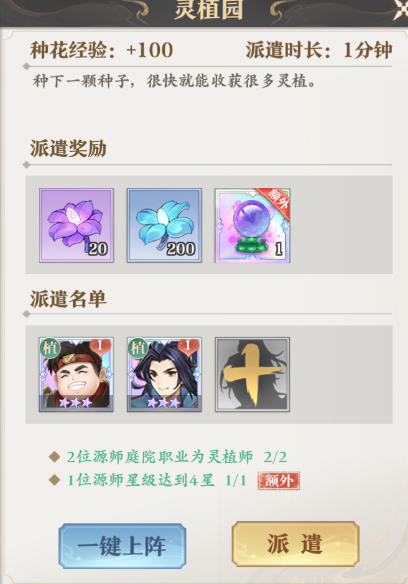 玩家们需要派出一些源师,在庭院等级是一级的时候,可以选择种植三种花,每一个品种需要等待的时间也不一样,通常每天可以选择【灌溉仙草】,这个任务需要四个小时才可以完成,完成任务后可以获得【稀有草药包】以及【吞吞幸运品】;第二个种植只需要1分钟就可以完成了,玩家们可以选择一键上阵;