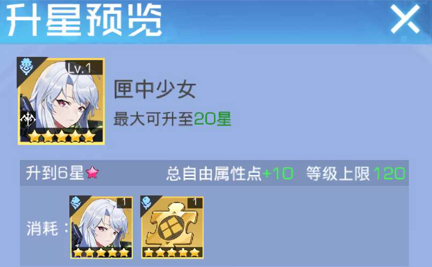 游戏方极为贴心的将每次升星的所需材料都列举了出来,同时最高星级为20星,这便需要玩家花费大量时间和精力。因为随着星级的提升玩家所需的材料也越来越多,从起初只需要一个本体探员和同系的五星探员,到最后的两个九星本体探员与六个同系的九星探员。