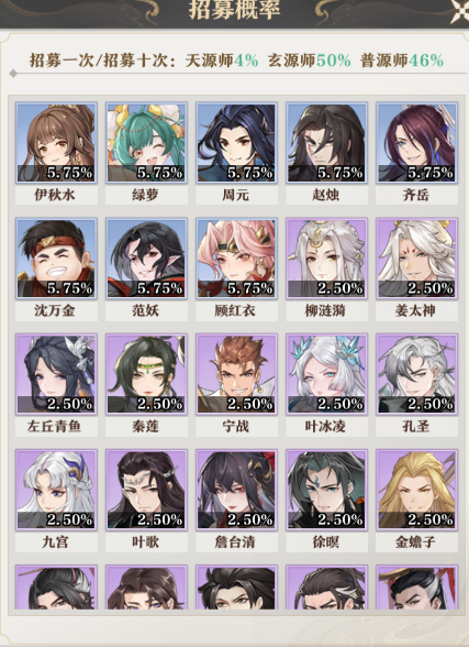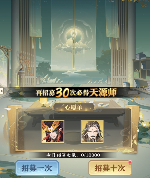 玩家们可以将自己喜欢的天源师加入心愿单,在招募的时候,获得天品质源师时有35%的概率可以获得心愿单里的源师;需要注意的是,心愿单中的两个源师是单独计算的,但是总体的概率是不会发生改变的,每天首次招募出心愿单中的源师后,次角色的概率就会失效;