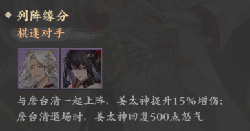 首先羁绊效果一定是第一选择,在詹台清与姜太神一起上阵的时候,詹台清可以额外获得20%的抗暴击效果;詹台清还可以给姜太神回复10%的怒攻伤害生命值,同时次队伍中姜太神也是需要作为主要输出站出来的;姜太神可以给敌人造成持续效果;