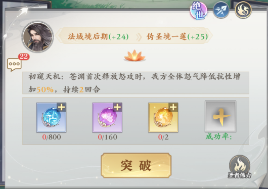 第二个培养方式是【境界】,每一个角色都可以进行强化突破,但是突破需要消耗大量的资源,【祖龙丹】目前是游戏中获取难度最大的一个材料了,不推荐玩家们在前期进行突破,