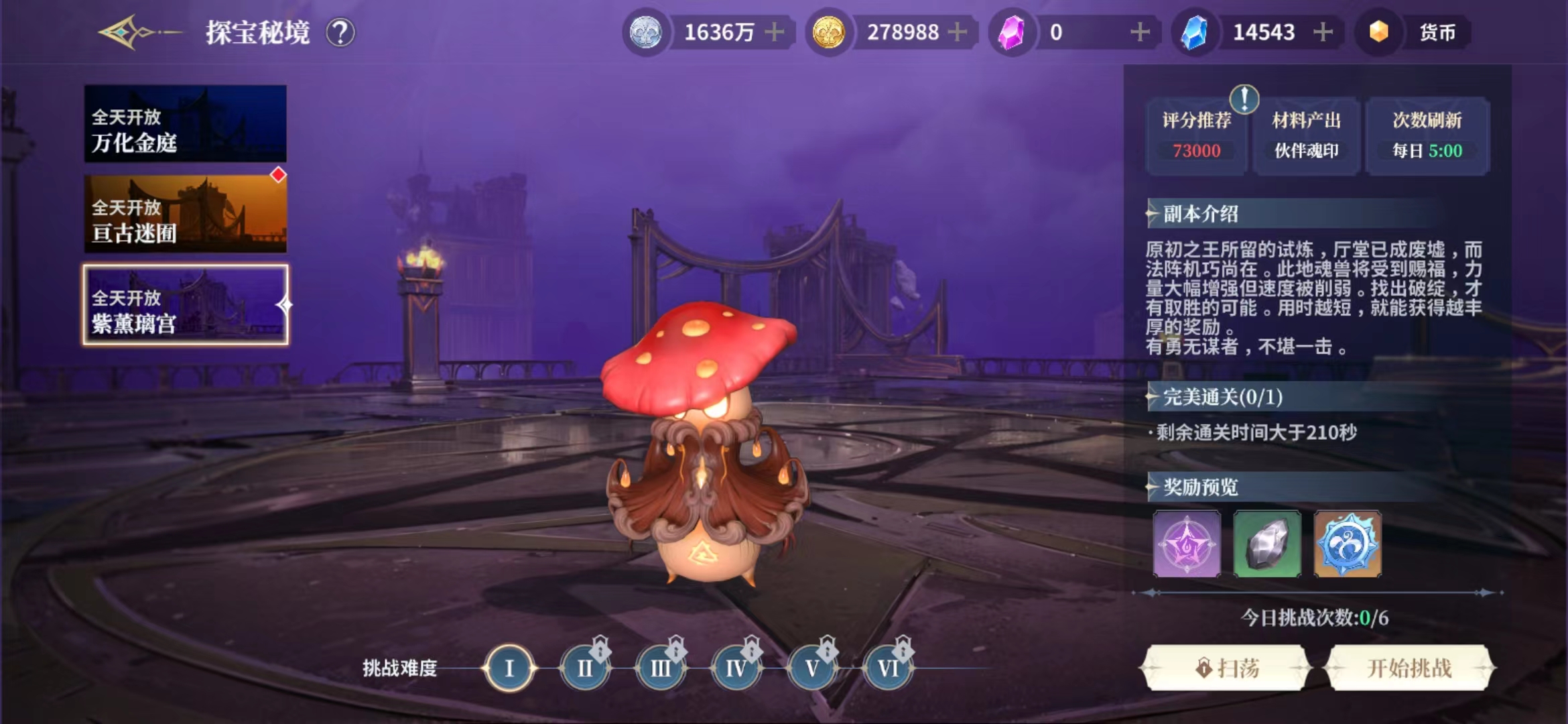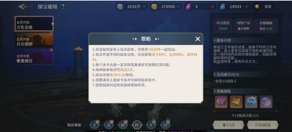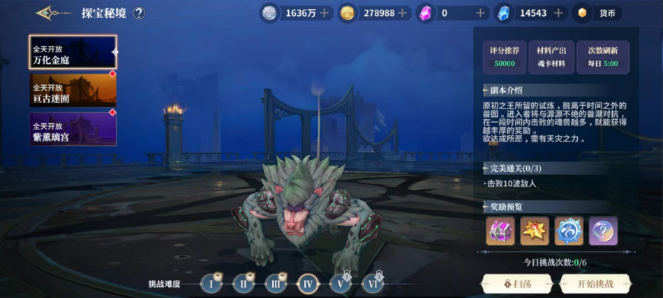 这是一个单人进入挑战的玩法,一天是可以体验6次的,而且当天次数没有体验玩还可以累积起来,不过只能累积三天,目前大家参与其中有三个地图可以选择,一个是万化金庭,还有亘古迷囿以及紫熏璃宫,每一个地图中出现的怪物都是不一样的哦。