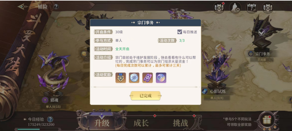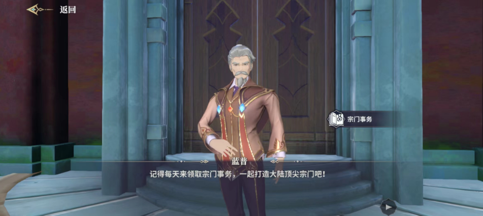 每一个宗门都是需要提升等级解锁上面更多建设的,所以这个宗门事务的玩法实际上也是跟宗门的建设有关的,大家完成之后还可以拿到专属的宗门贡献度哦,想要参与这个玩法大家必须要提前加入宗门,然后到宗门的领地中找到台阶上面的NPC蓝普,在他这里大家才可以领到宗门事务的任务。