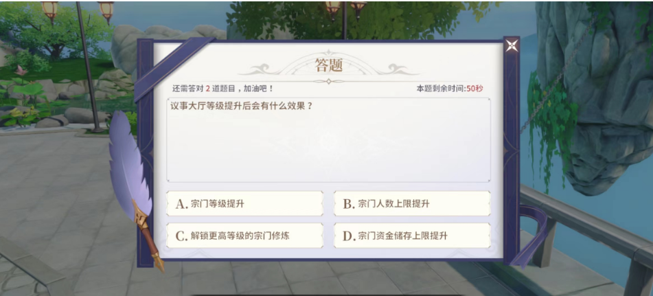 需要玩家一共答对三道题才可以算是完成宗门的人物,上面出现的题目会有很多都是重复的,如果大家想要在上面获取足够的奖励,每一道题都是会给大家一分钟的时间来答的,可以去搜索之后回答,就算回答不对大家也不用担心,会出现很多道题给大家参与,只要累积答对了5道题大家就可以拿到奖励啦。