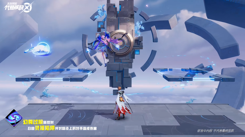 二技能:貂蝉向指定方向快速移动一段距离,并在移动过程中召唤出所有已存在的灵猫陷阱。灵猫陷阱会对路径上的敌人造成伤害,并为其叠加一个标记。这个技能可以用来追击或逃跑,也可以用来激活陷阱进行爆发。