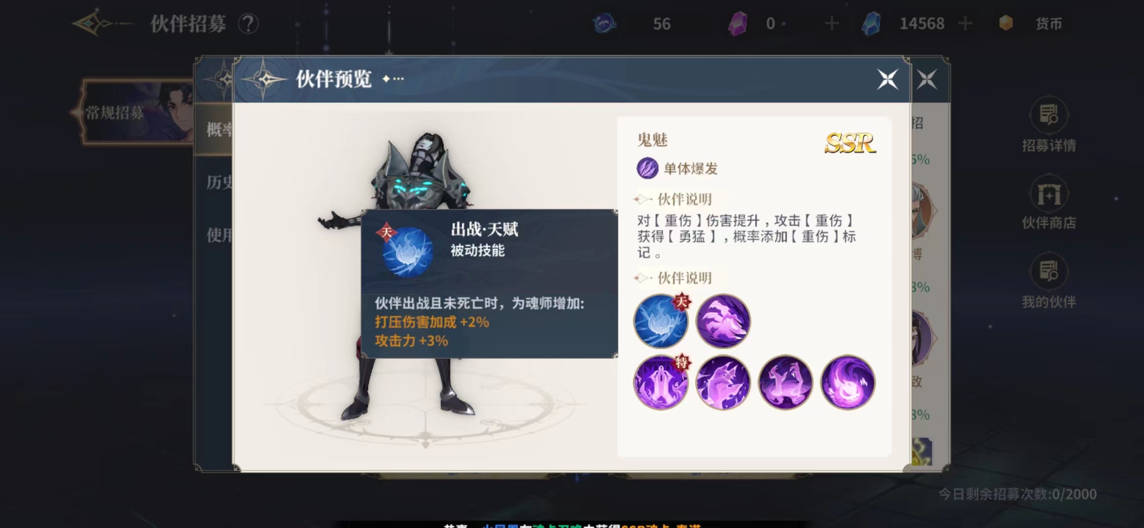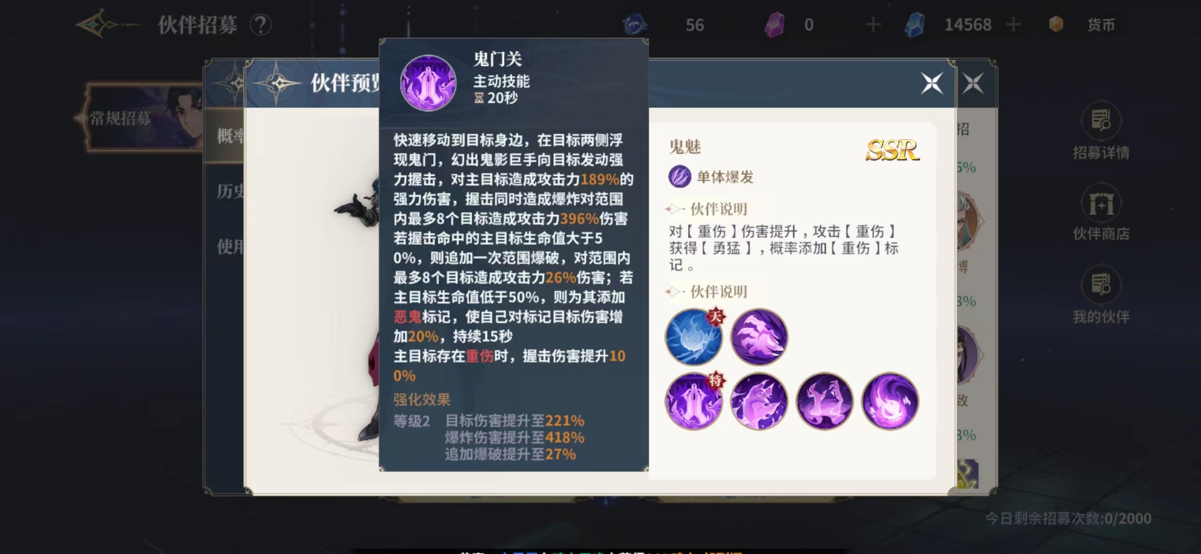 鬼魅的出战天赋上面有一个伤害加成2%的效果,攻击力也会得到3%的加成,所以他在输出上面比较强,鬼门关这个技能在游戏中是可以带来189%的强力输出,在造成输出的输出的时候还有一个同步的爆炸伤害可可以给周围的敌人带来396%的爆炸伤害,被击中的敌人身上的血量高于一半的话会追加一次爆破伤害,这一次只有26%的伤害数值。