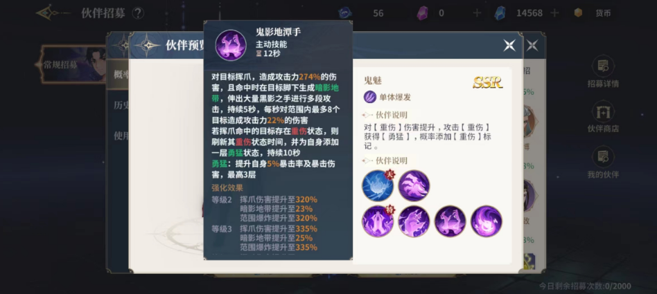 鬼影地潭手则是带来274%的伤害之后生成一个地带,这个地带会带来持续5秒的输出,每一次输出22%的数值,要是敌人重伤的话就会给鬼魅带来勇猛的状态加成,这个勇猛的状态会持续10秒的时间,这10秒时间之内鬼魅的暴击以及暴击伤害都会提升5%的概率。