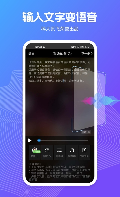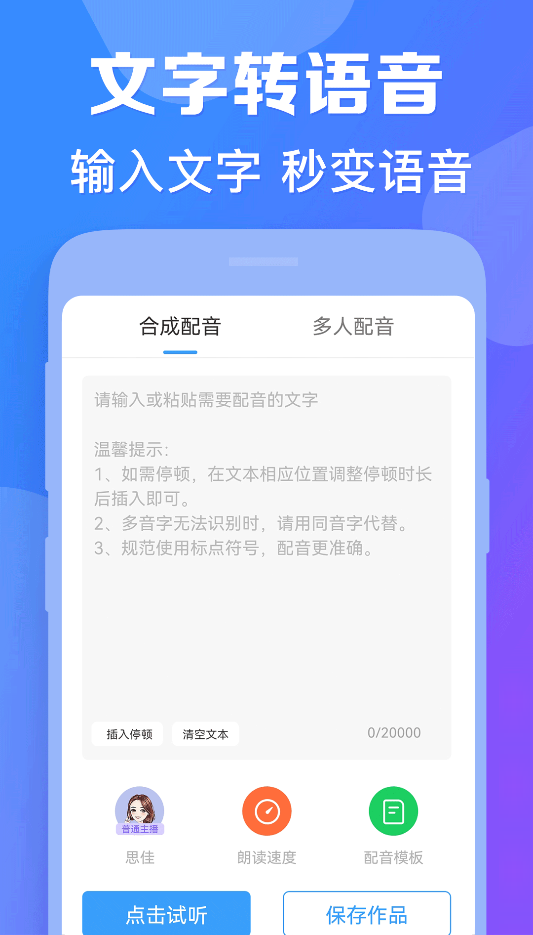 可以广泛的运用于广告促销、产品宣传和短视频配音等等,真人配音和合成配音共同协作帮助大家完成作品,支持添加背景音乐,让大家的配音作品更加精彩,输入文字就可以快速的导出MP3和MP4格式的音频。
