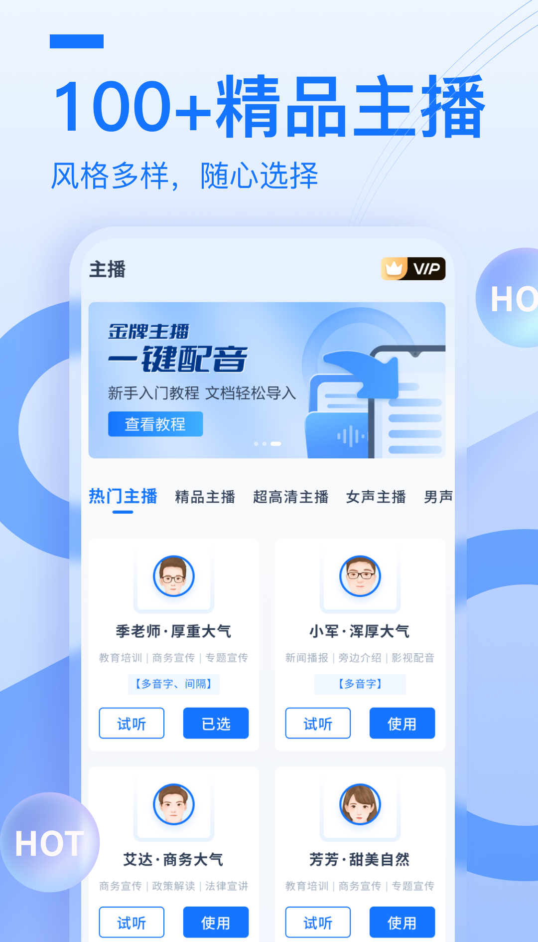 一百多位精致的主播在线为大家进行配音,可以对录制的音频进行智能的编辑,多种格式自由导出一键分享,采用智能的AI技术,让每一种声音都能高度拟人化,中文、英文和方言随意切换。