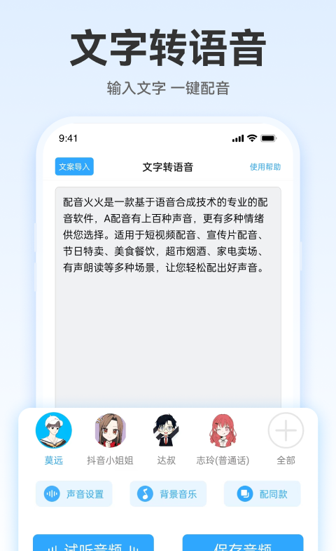 百万网红都在用的配音流量神器,通过这个软件完成配音之后能够赢得非常多的流量,采用的是当下非常强大的语音合成技术,输入文字进行点击就可以快速转换成语音了,制作好的音频也可以直接导入在手机当中。