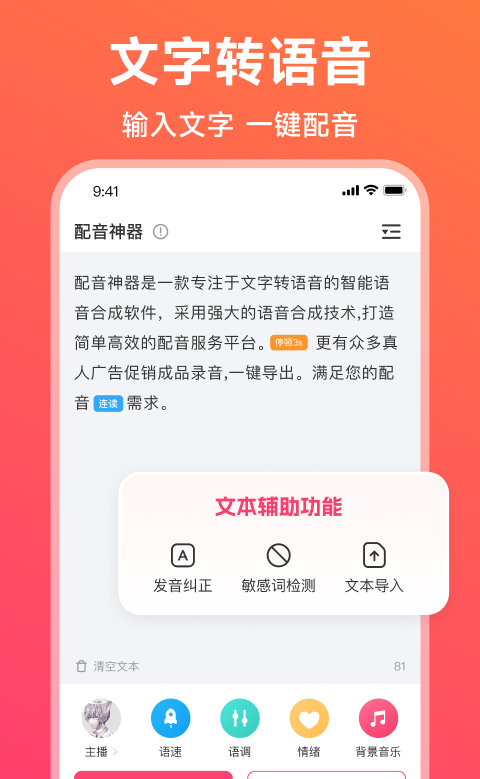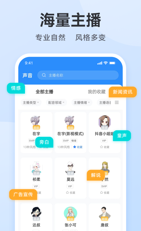 想要为广告配音大家就去选择这个APP,把输入的文字转换成语音这项操作也是非常方便的,海量的主播都有多种声音都可以随意挑选,各种音频和视频都可以一键导出,多种视频剪辑的工具都可以随心用。