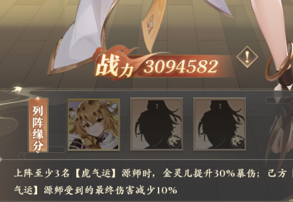 输出角色选择了秦莲来作为虎气运的搭配之外,秦莲自身的攻击可以让敌人进入眩晕状态,弥补了队伍中没有控制效果,同时还可以给敌人附加一个20%的增伤buff,万祖最为目前游戏中减益效果最强的辅助一定是需要上场的,同时也是可以激活虎气运;