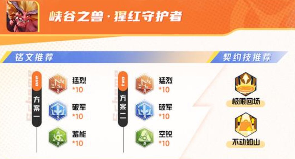 猩红守护者是一个近战物理型英雄,他的技能主要以控制和伤害为主。他的一技能是摔!向指定方向冲锋进并抱摔对手。这个技能可以用来追击或逃跑,也可以用来打断对手的技能释放。强化过的一技能眩晕时间更长,可以配合队友进行团战。