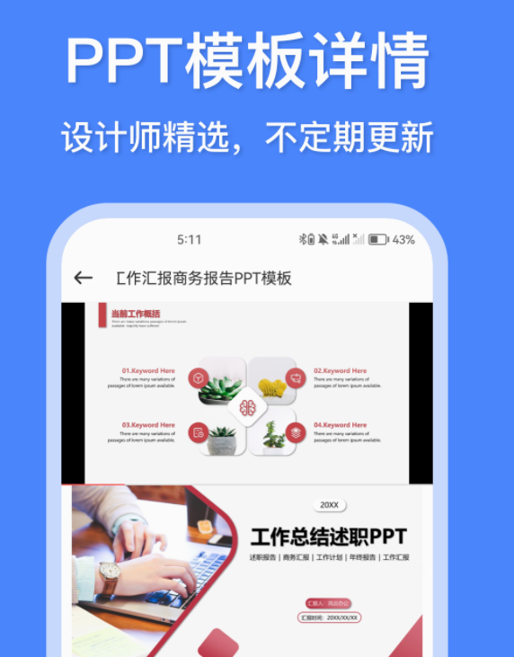 超过六万多种的ppt模板均可直接使用,彻底就改变了ppt制作困难和没有思路的难题,除了现有的素材资源外还会有不定时的持续更新,要是用来演讲、开会、汇报、述职的话都能找到相应的模板。