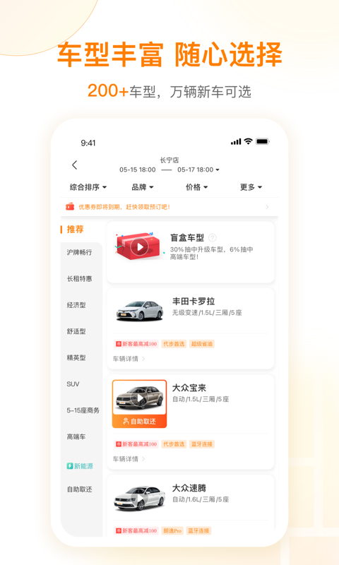 这是一款支持全国直营连锁的租车软件,而且支持异地换车。新人使用的话,不仅有各种大礼包,而且还能享受零元车辆押金的租车服务。目前在我国500多个城市,11000多个,网点儿提供了有200多个车型。基本上是在了我国各大城市,让大家走到哪里都可以有车租。