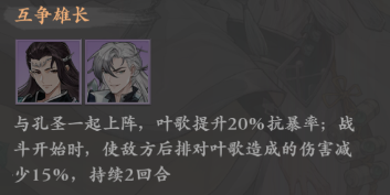叶哥在与孔圣一同上场的时候,可以增加叶歌20%的抗暴击效果;搭配伊秋水可以增加叶歌的生命值,这套阵容主要是为了保证叶歌的存活率,同时让主力输出成为【孔圣】,孔圣在游戏中是一个非常有潜力的突击角色,双方的羁绊激活后都不太一样,在与叶歌一起的时候,孔圣的伤害在对前排源师攻击时,会造成15%的额外伤害;