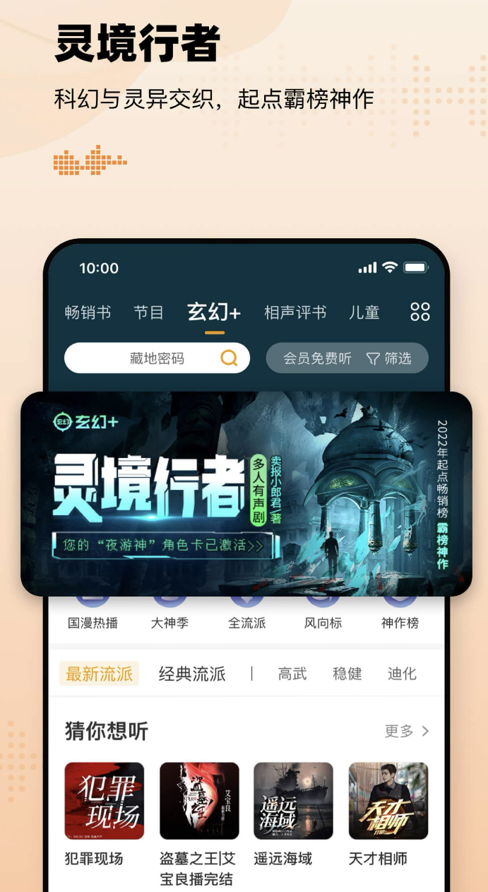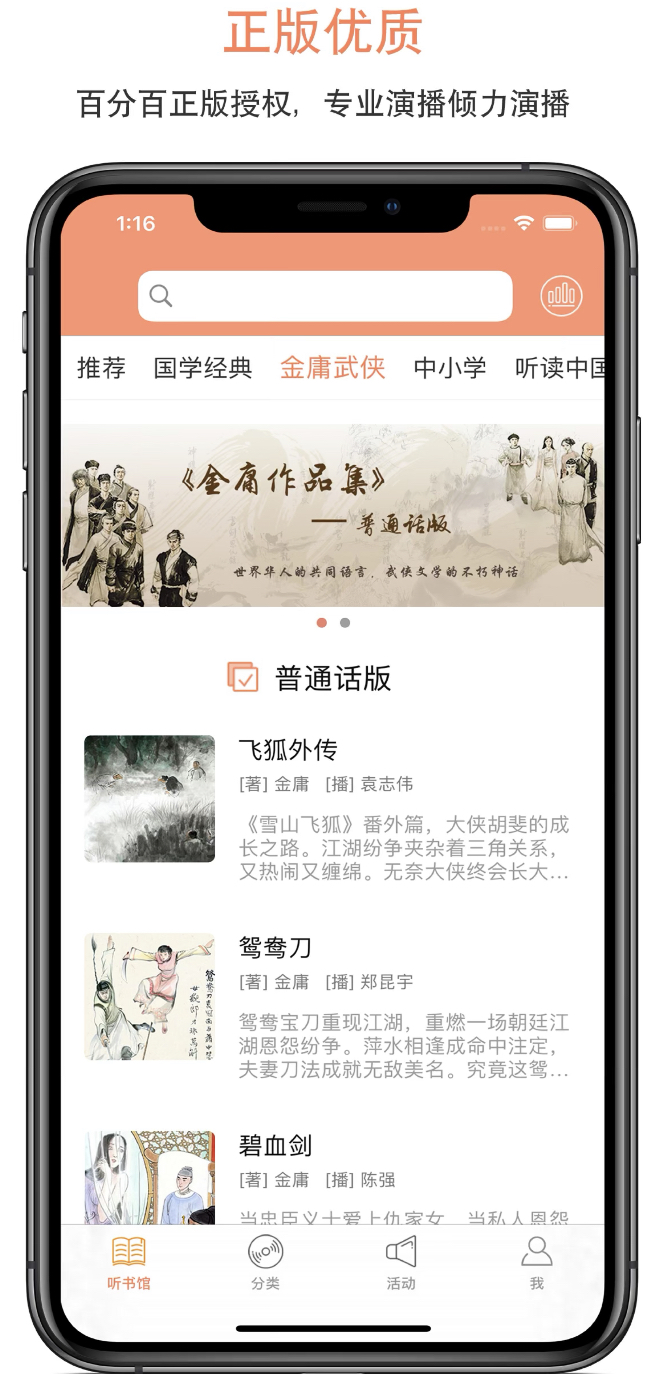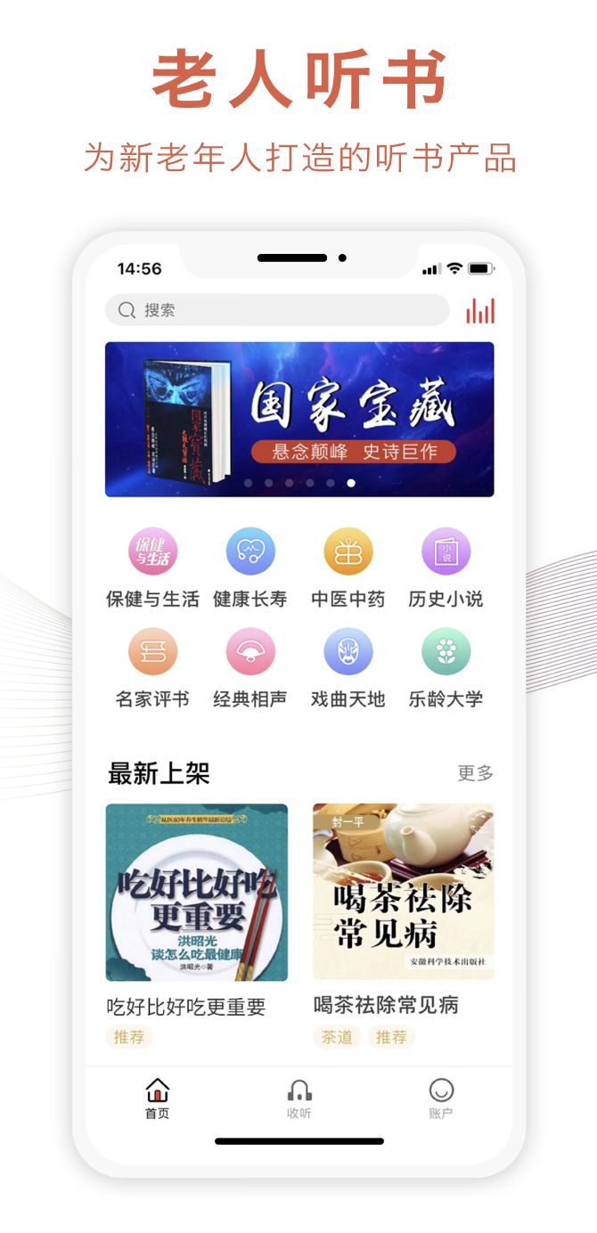 这里提供各种正版小说资源,都市言情,惊悚刺激,复仇爽文等各种类型应有尽有,满足你的需求。除了这些吸引年轻人的小说资源,这款软件的受众群里还有中老年人,这里有专门为中老年人打造的听书区域,中老年人喜欢的评书,戏曲,故事等都可以在这里免费听。