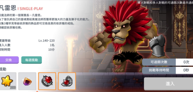 狮子王城是冰原雪域中的主题地城,远征队BOSS是凡雷恩。要挑战凡雷恩,玩家需要先完成狮子王城的前置任务,其中包括三阶段的解除封印任务。见到城主卢顿后,可以接取前往见面室的任务。 在远征地图内,使用消耗品和BUFF道具会有20秒的冷却时间,冷却时间内无法使用凡雷恩会在双手上出现黄橘色的图腾,并有捏碎的动作,会消除玩家的辅助技能效果。凡雷恩会在单手中出现红黑色的漩涡,然后传送被中招的玩家到监狱区域。在监狱中,玩家需要普通攻击地图上的宝箱来找到钥匙,才能离开监狱。