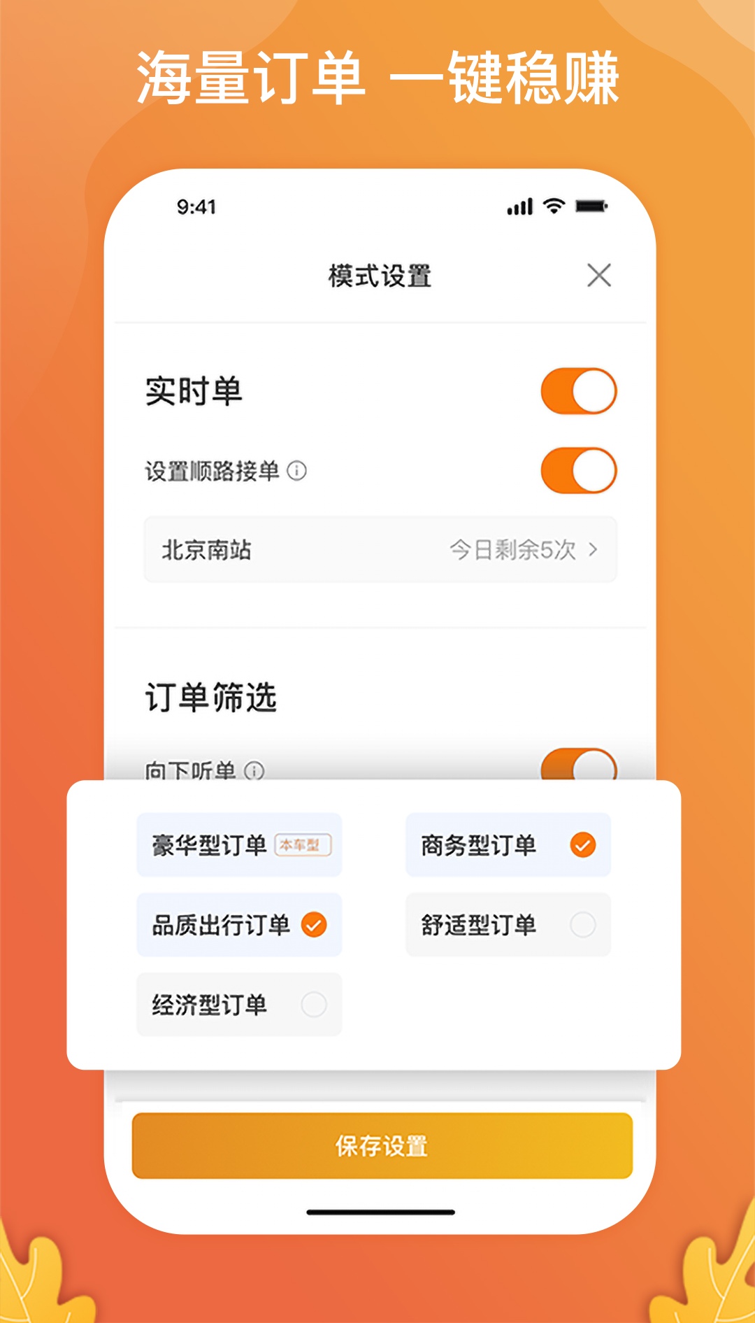 门对门就可以接送,一键直达,给司机提供了更加赚钱、更加简洁、更加合理的平台,订单的来源非常稳定,不管你是全天的还是以小时为单位的都可以,也可以对那么多的订单进行筛选。
