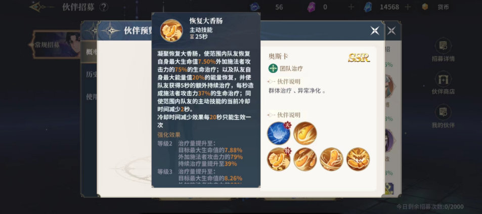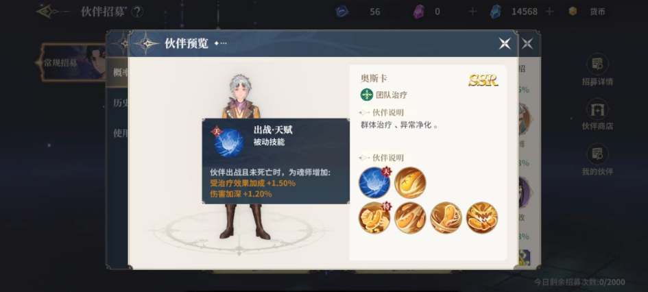 奥斯卡的出战天赋是可以带来1.5%的治疗加成,以及1.2%的伤害加深效果,恢复技能上面是可以给技能范围之内的敌人都带来治疗的,每一个队友都地阿莱自己生命值7.5%的血量恢复,而且还会根据施法者自身攻击的75%数值带来治疗,这个治疗效果加成在一起就很好用了。