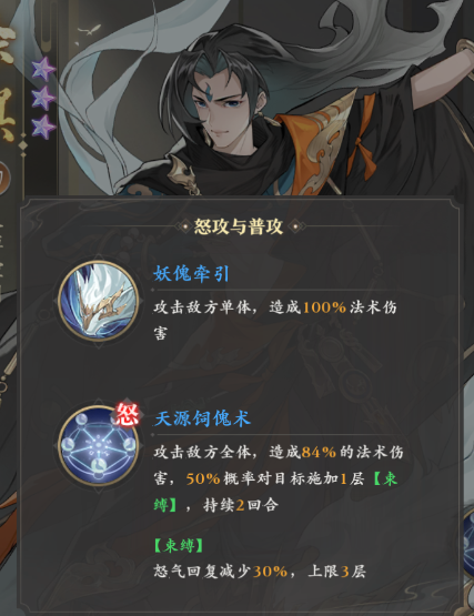 首先玩家们在搭配阵容的时候,一定要先对源师要有一个定义,徐暝在游戏中是一个有特殊效果的前排,自身的攻击可以敌人造成法术伤害,同时还有一半的概率可以对敌人施加减益效果,让敌人回复怒气的值减少,同时在玩家们释放怒攻之后,还可以获得一个可以吸收一半伤害的傀儡,可以说是非常能抗的;