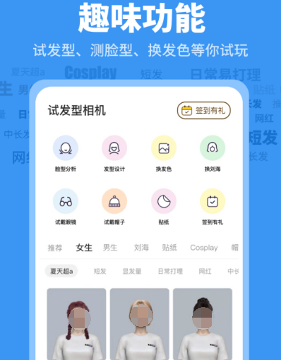 现在发型是很多小伙伴谈论的焦点,发型被大部分人关注,美发行业如今也变得特别火爆。如果小伙伴们想要测试发型,想要了解一款发型是否真正的适合自己,那么可利用这款软件,其中有AI智能脸型分析功能,抖音、小红书等各种短视频平台上火爆的发型是否适合自己,在这里可一目了然的看。另外还能根据个人的脸型进行设计,包括烫发、卷发、短发以及头发颜色等。