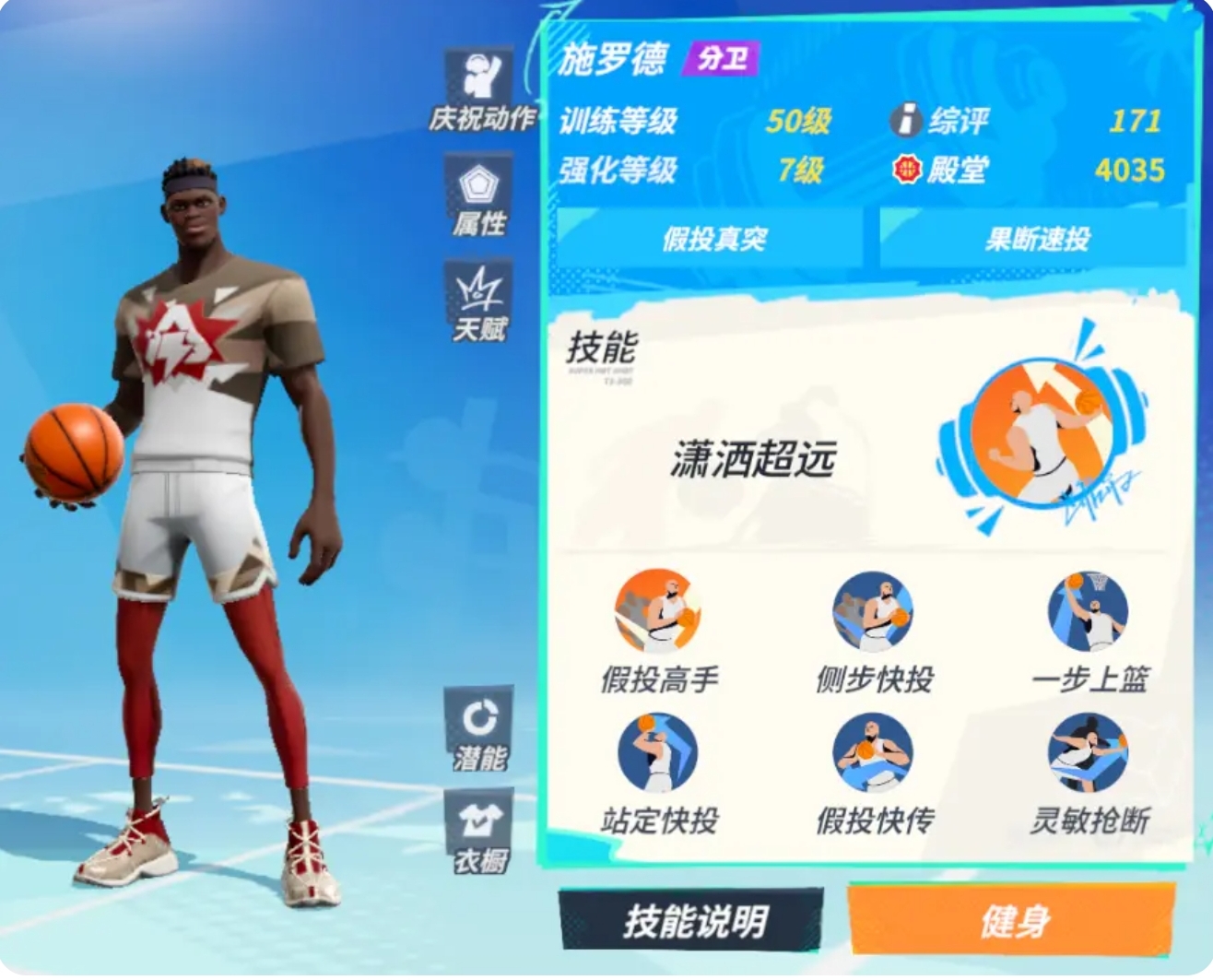 施罗德在游戏当中是一名非常不错的选手,他非常适合比较喜欢中距离投球的玩家们进行选择,根据属性面板可以得知,它唯一的弱点就是在内线的防守以及进攻较弱,玩家们注意这一点就可以了。