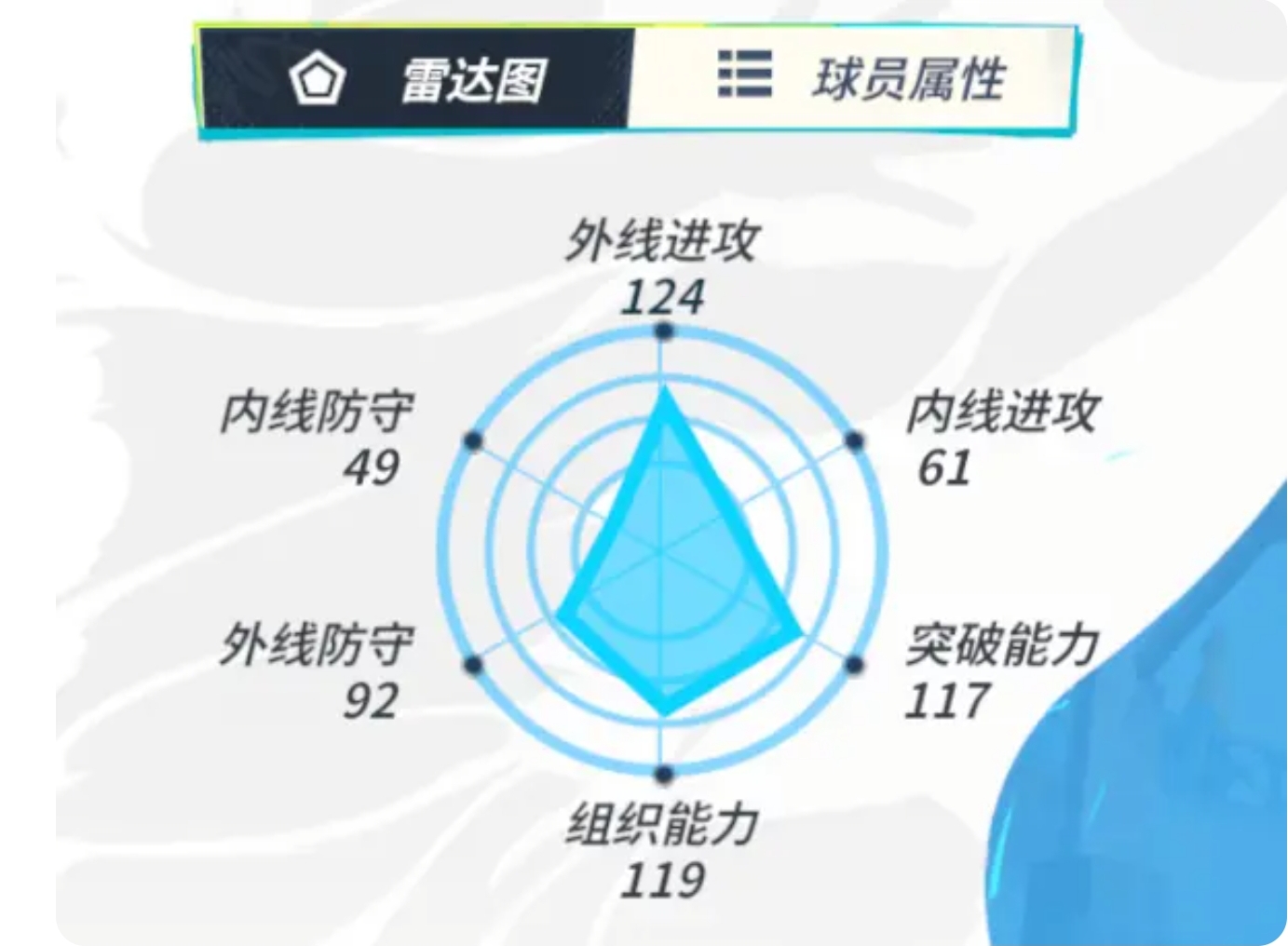 他作为一个非常出色的分位选手,投射能力也是十分强悍的,熟的假动作更是让他整个人都充满了迷惑性,让对手猜不出他下一步的动作到底是什么,还有他的传球能力以及机动性也是非常强的。它的属性面板可以看出这名选手非常适合外线进攻以及个人突破,他的这一能力可以帮助他更加有效的发起快攻帮助球队得到分数,唯一的缺点大概就是他在内线的进攻以及防守能力都不太行。他的优势点就在于他比较擅长中距离头球和运球以及近距离头球上面,所以他也是一名非常适合三分位的选手,优秀的传球能力让他在游戏当中非常具有危险性,他无论是和队友进行配合,还是自己运球单打都是十分不错的。