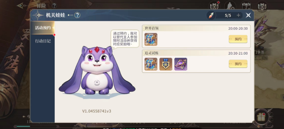 比如世界首领就是只有在8点才会出现的,大家可以浏览周历了解自己可以参与的活动之后去进行预约,预约的活动有限,但是只要是预约过的活动,就算大家当时没有上线,也会有系统自动参与该活动,在完成了当天的活动之后大家还可以在行动日记中查看自己的当天奖励。