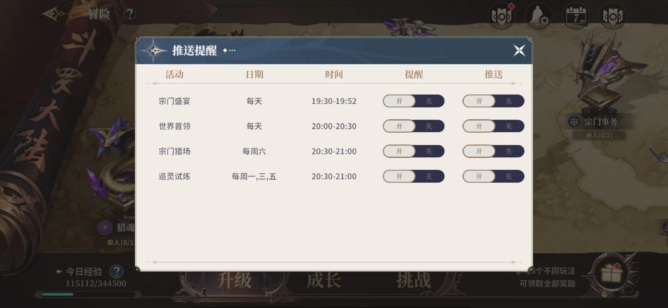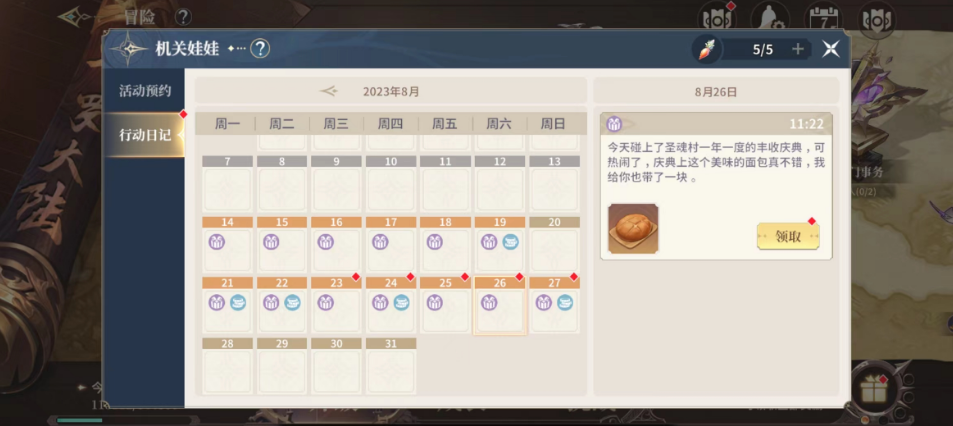 有些是活动奖励,还有一些可能是触发剧情的奖励,大家可以在周历旁边的机关娃娃处查看,如果是不能预约但是又很想参与的活动,那么大家还可以在周历旁边看到一个推动提醒,可以在上面将相应活动的提醒给打开,这样在活动快就开始直接系统就会提示大家要去参与活动啦。
