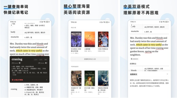 在一些重要文献和著作中很多都是只有英文版本,这些文件中会有很多的专业术语,想要通过简单的搜索可能会影响对文件的翻译,那么这款软件上不仅有各种英文原本的名著和小说内容,还提供一键查单词和段落翻译。