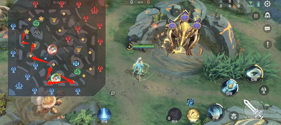 选完英雄和分路后,经过短暂加载就可以正式开始游戏了,游戏中根据分路的不同,所负责的事情也不同,上中下都只需到自己的线上补兵发育,然后和对手换血博弈即可,打野的话则需要兼顾刷野和游走抓人,大家可以参考下图的路线从红buff处开始刷野。