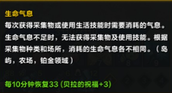 之所以将“生命气息”放在首位,是因为其的作用不可或缺,无论是使用生活技能还是采集资源,都会消耗一定量的气息,而气息则是自动回复,除非官方好心赠予玩家一些体力,便再无其余回复方式,只能耐心等待。同时商场中有着“跳跃精华”售卖,玩家在使用后会花费双倍活力来获取双倍材料,大大提高了效率。