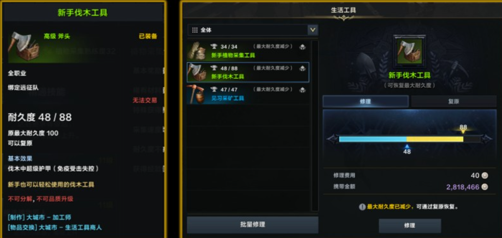 玩家可以利用相应的生活技能来进行资源的采集,将获得的材料进行售卖或者进行二次加工,制造成全新的物品。例如玩家可以通过植物采集去收集草药来制造药品,这样可以减少战斗时的压力;而采矿、考古等技能则可以获取装备的升级材料。并且每次使用生活技能,所对应的工具耐久度会有所减少,在耐久耗尽后玩家需要对该工具进行修复,否则将无法继续使用。
