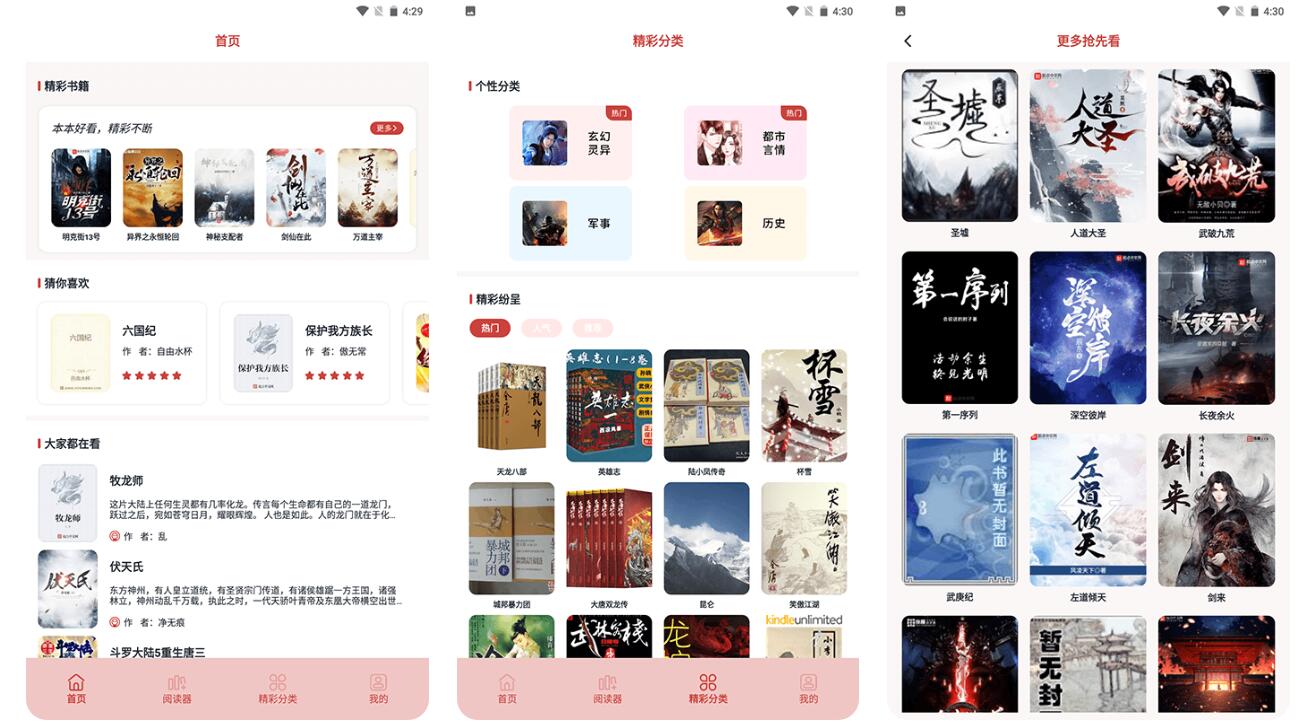 多样化的书籍内容,大家都可以在本款app的不同专区内获取。应用的整体操作也十分简单,各位可以利用完善的分类机制查询喜欢的作品。不仅如此,新上线的人们小说也会在首页进行展现。