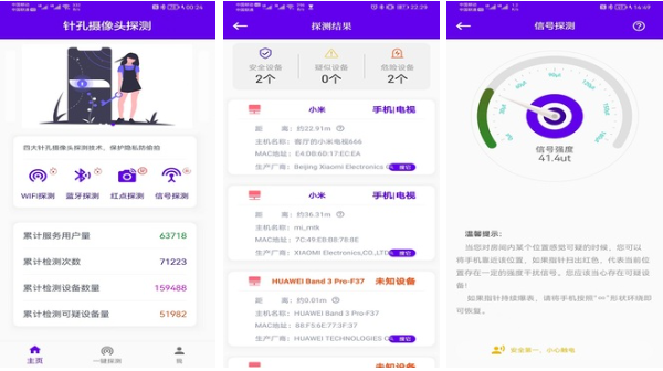 通过无限网络协议和fing原理,接入网络下进行针孔摄像头的甄别和定位,还能通过底层的蓝牙传输协议及时发现更高端的依靠蓝牙进行传输的摄像头软爱能,让用户的住宿安全等级再提高一个等级。