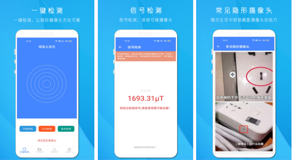 不管是什么类型的摄像头,在制作上都会依靠到金属的配件。那么这款软件就是一款纯金属探测的仪器,靠近金属就会发出警报,那么用户就可以判断这是否是自己的设备,也能更加全面的找出隐藏是摄像头。