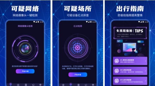 这款软件在用户入住酒店的时候会很好用,操作上很简单,可以一键扫描房间并进行深度的探测所有的网络摄像头,将所有的隐藏的摄像头都找出来,给用户一个安全的入住环境体验。
