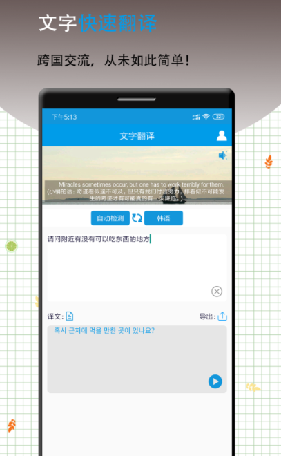 《翻译器》不仅支持英文翻译,还能翻译多种其他语言,如韩语、日语、泰语等等。它提供了多种翻译方式,其中包括通过拍照翻译图片上的文字。我们只要将相机对准图片,即可迅速获得所需语言的翻译结果。此外,该软件能够保留原文档的排版,并对内容进行翻译。它还是提升外语水平的有力工具。