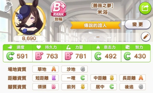 场地资质有A级的草地和G级的沙地,所以她能跑的场地很固定,距离资质则是E级的短距离,C级的一哩,S的中距离和A级的长距离,可以明显看出这是个擅长中长距离的马娘,脚质资质也是特点鲜明,她明显更擅长于前列和领头跑法,居中与后追跑法则不太擅长。