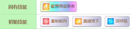 其固有技能是蓝蔷薇追击者,可以在最后弯道反超对手后额外提升自己的速度,非常有利于最后的冲刺夺冠,初始技能则包括能够在竞赛初期让前方马娘更容易陷入疲惫的“牵制前列”,在前列位置时更擅长下坡的“直线滑下”,以及长距离直线冲刺时能变得不易疲倦的“深呼吸”。