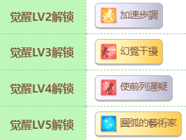 觉醒后也有四个技能,二级的加速步调可以让他在比赛中期赶超对手时略微提速,幻觉干扰也和干扰一样是在比赛后程处于前列位置时缩小身后对手的视野,四级解锁的使前列迟疑增强了她后程反超的能力,可以让前面的对手陷入迟疑并略微减速,五级的“圆弧的艺术家”则和弯道回复一样也是用最佳方式过弯后提供持久力恢复。