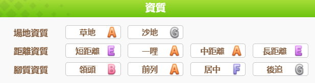 场地资质明显是更擅长于草地这方面,G级的沙地几乎属于完全没法跑的水平,距离资质则更加擅长一哩和中距离两种长度,在训练的时候往这两方面去考虑会有更高收益,跑法这块,则更擅长在前列和领头的位置进行奔跑,一旦居中或者落后基本上就没法再有良好表现了。