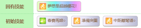 技能方面,她的固有技能“梦想是超越樱花!”可以在赛道剩余不足三百米时通过追近对手来获得额外的速度提升,十分适合终点前的反超。再来看初始技能,第一个“春赛马娘”可以让其在春季赛有更好的发挥,“准备突围”则可以让她在最后弯道更容易突围,“中距离弯道”则增强了她在弯道上的速度。