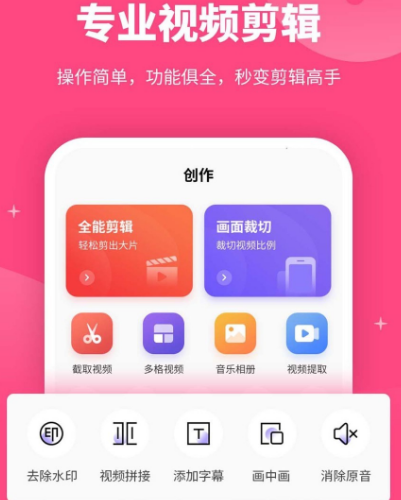 好评率高达5颗星,几乎在每个应用商店当中都有超高下载量,这是非常专业的剪辑软件,不仅可去除水印,同时还有其他超全的编辑功能,比如热门短视频、视频剪裁、视频拼接、视频抠图等等,另外还能制作音乐相册。有关于短视频的各种内容,这里全部包含有音乐MV相册,另外还有特效转场、字幕、滤镜、涂鸦等。