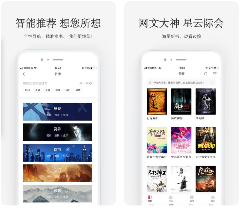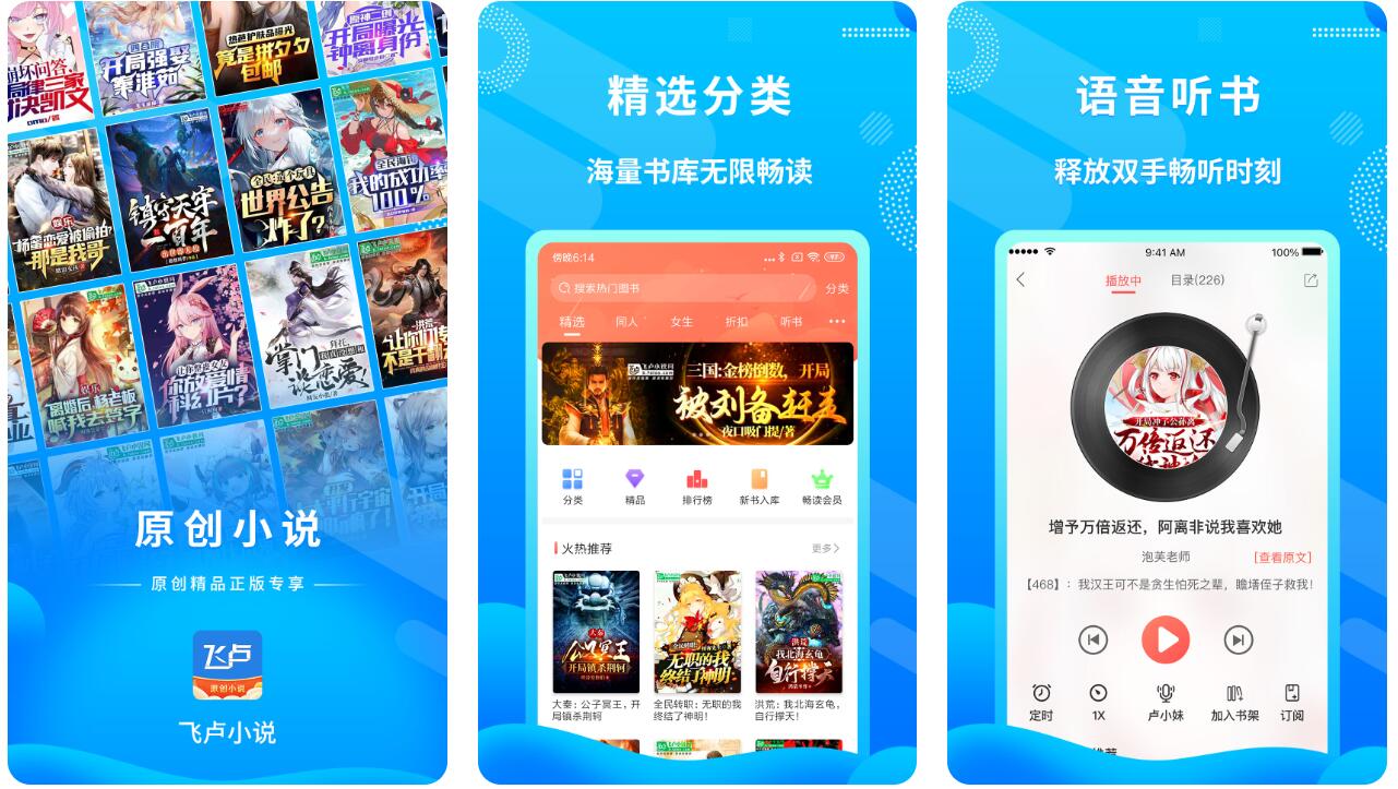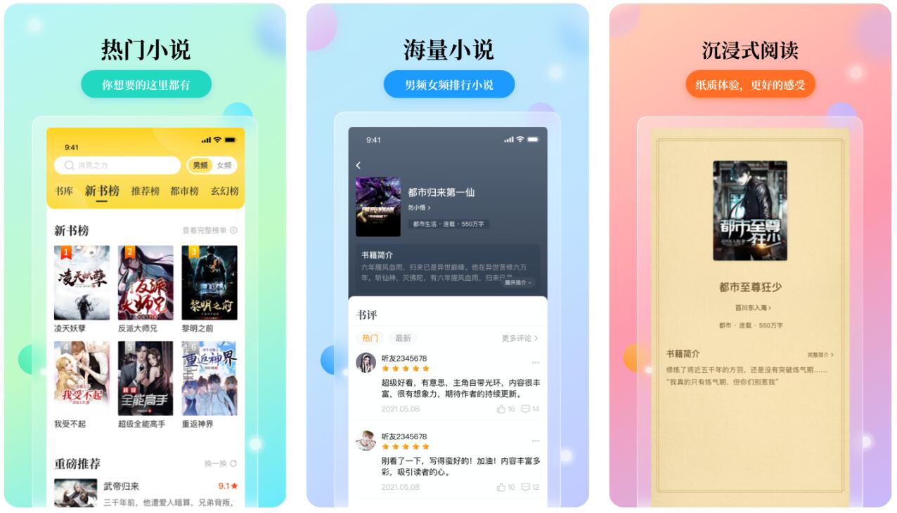 在应用的主界面,用户可以获取到各大题材榜单,其中丰富的小说作品各位可以随意选择阅读。当然了,用户们还可以通过小说的类型进入到书库当中进行查找,而app的阅读模式当中也可以直接体验朗诵模式。