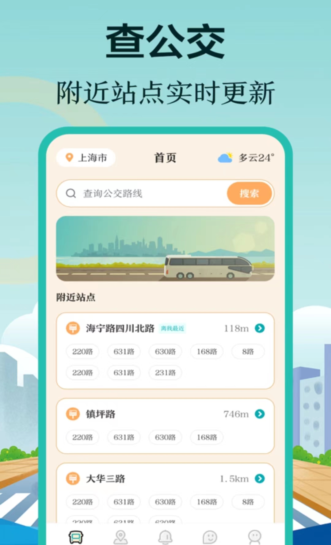 实时公交这款软件是一款高效的一款软件,可以进行公交定位,对于我们附近的公交站点一目了然,还可以给我们提供坐多少路公交,公交车距离我们多远,这款软件还有导航,可以把我们想要去的地方都可以输入出来,就可以出来路线。最实用的一个功能就是提供天气情况,可以有效的避免天气影响我们的出行。