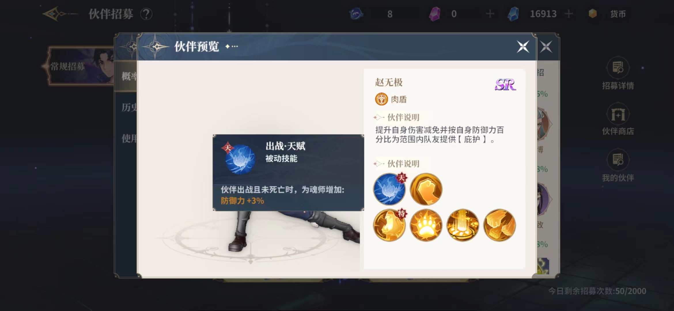 赵无极的出战天赋是一个被动的技能,因为他是属于一个前排的肉盾角色,所以在出战的时候只要在场,那么就可以带来防御提升3%的效果,对于白虎职业的玩家来说,就是强上加强,赵无极可以提升自身伤害减免并按自身防御力百分比为范围之内的队友提供庇护的效果,也就是说其实赵无极是可以当做一个保护类的伙伴使用的,不过他的普攻技能并不是一个防御技能吗,而是对目标进行多段猛烈攻击,这样的攻击没有额外加成加上赵无极本身的输出也不算很高,所以在战斗场上的效果不算很强,他的强度主要还是在于保护技能上面。